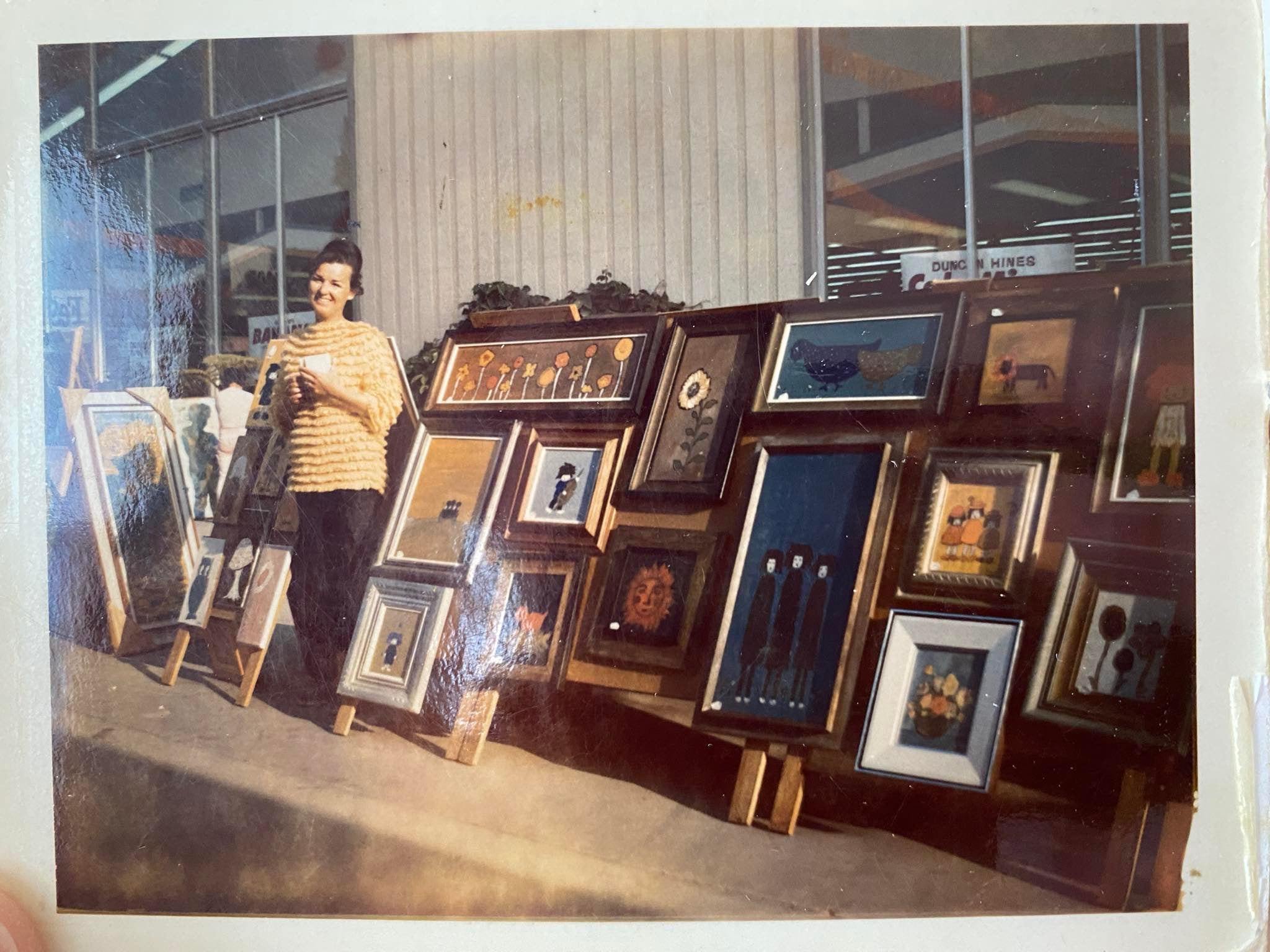Above are some photos of moms studio and the earliest photo of mom's art career. This early one is in about 1961 in front of a grocery store in Orange County, California. This is where we got started. Dad arranged the frames, mom painted and both sold her art on the street. I remember these days well in our old Ford station wagon while i was about 5 and my sister was about 2.